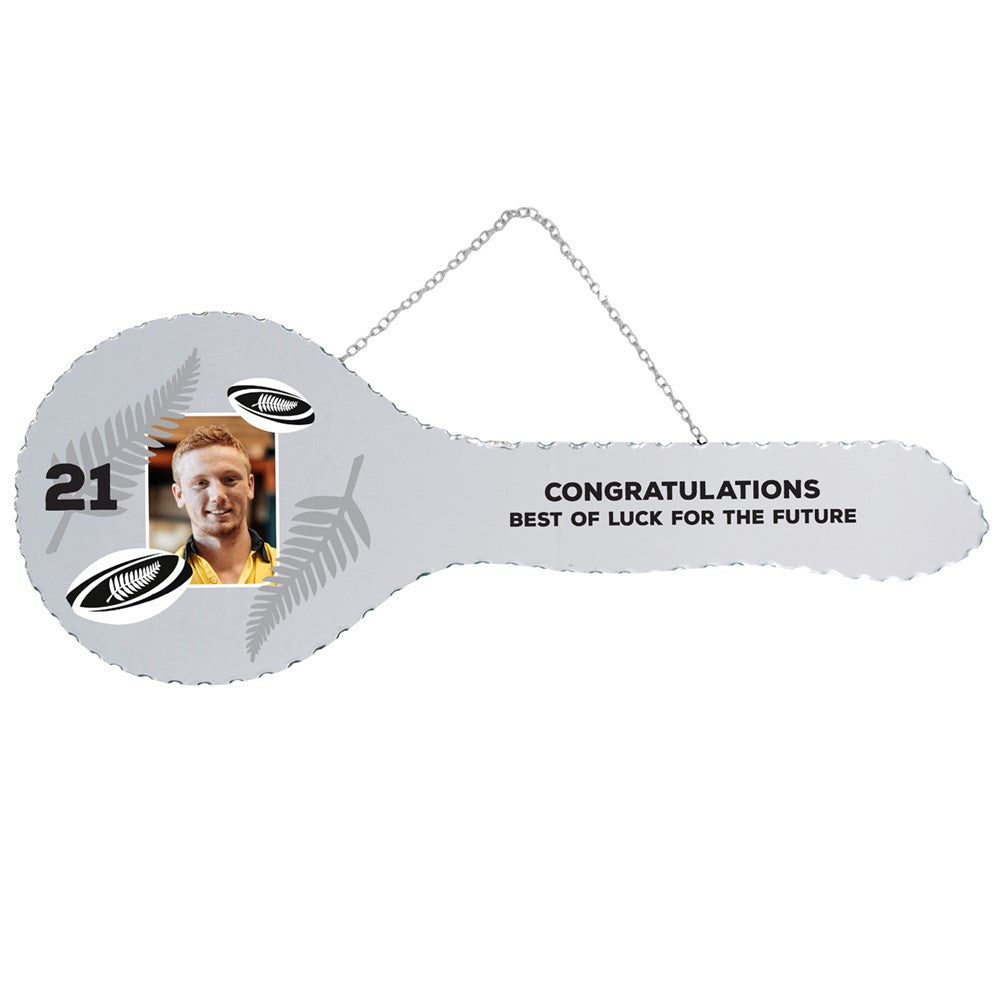 Designed for that sporty rugby union/league male or female and featuring a lovely kiwiana fern design and space for a photo. This is a mirrored 21st key with a 9mm MDF backing so the key can be signed by guests and loved ones. It also features a scalloped edge and hangs from a 340mm silver look chain. Size: 524mm x 205mm.