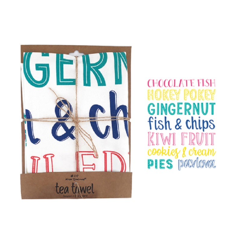 Add a pop of colour to your kitchen! This tea towel features stylish word art of classic NZ food ("kai" in Māori) and is full of bright colours.