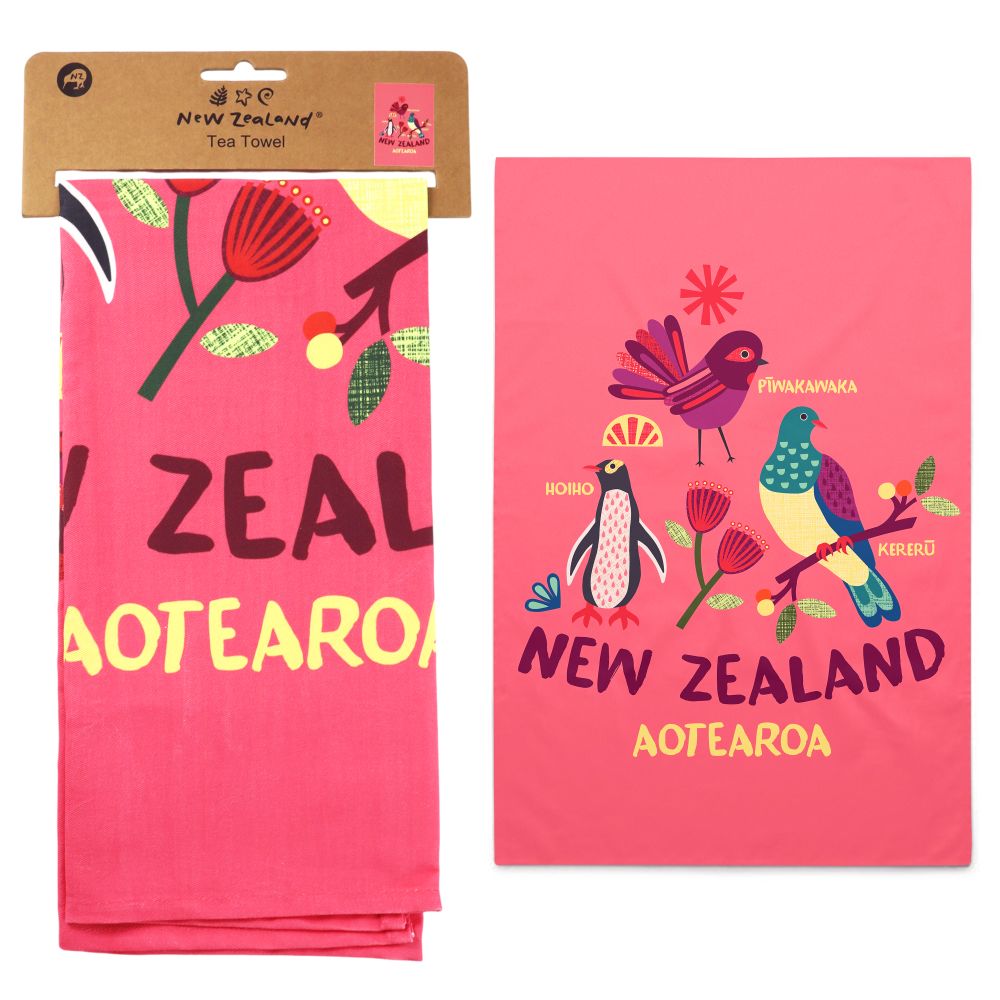 A peach tea towel with a large New Zealand bird and floral print. The perfect way to bring some New Zealand culture into the kitchen with a pop of colour. A compact and practical souvenir that won't weigh down your luggage.