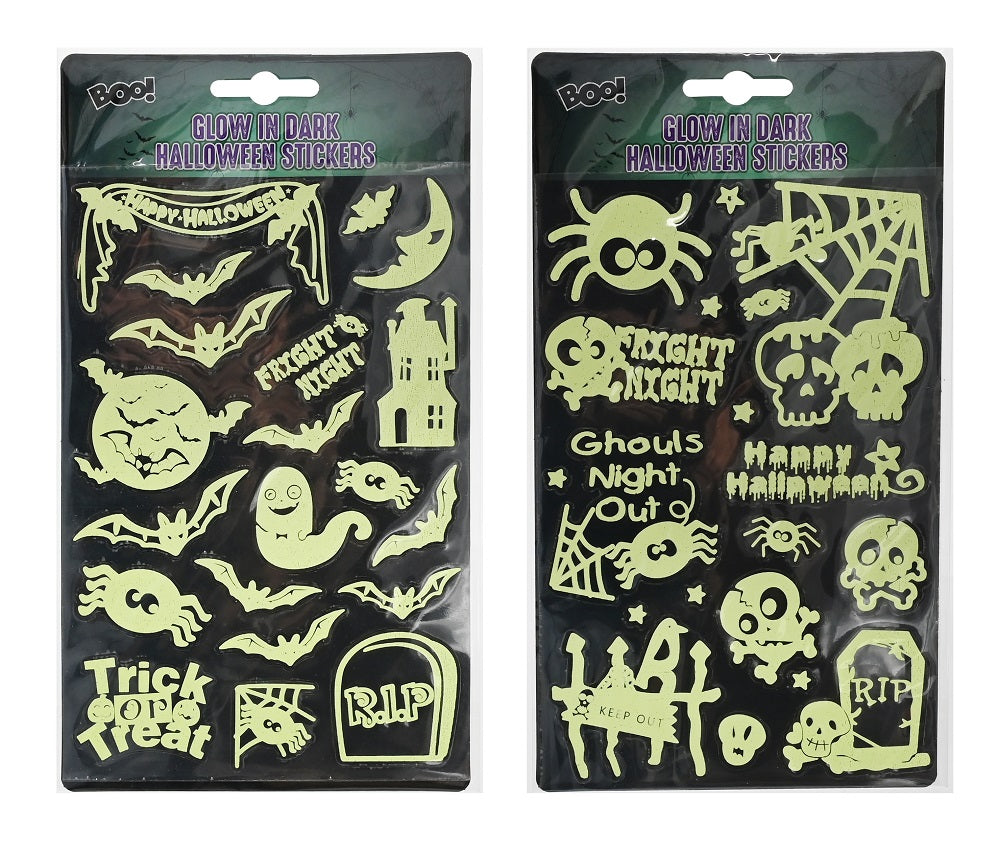 Light up the fright this Halloween with these Glow-in-the-Dark Halloween Stickers! Featuring spooky designs like bats, ghosts, skulls, spiders, and haunted houses, these glowing stickers bring a fun, eerie touch to walls, windows, trick-or-treat bags, and party décor. Charge them under light, then watch them glow when the lights go out — perfect for kids’ rooms or Halloween parties!