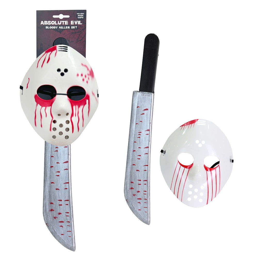 Create a spine-chilling look this Halloween with the Absolute Evil Bloody Killer Set! This terrifying accessory pack includes a white plastic hockey mask splattered with red “blood” details and a matching fake machete, perfect for completing any horror-themed costume. The realistic design adds an extra level of fright to your outfit, making it ideal for haunted house events, costume parties, or trick-or-treating.