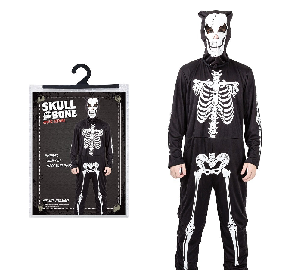 Costume Skeleton Jumpsuit With Hooded Mask Adults Get ready to spook your friends with this Costume Skeleton Jumpsuit! (But don't worry, it's not actually made of real bones.) Whether you're dressing up for Halloween or a costume party, this jumpsuit will be a hit. The hooded mask adds an extra touch of creepy fun. No bones about it, this jumpsuit is the perfect choice for anyone looking to have some fun and turn heads at their next event!